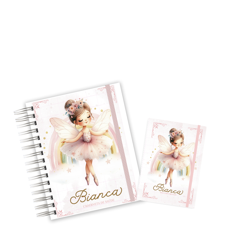 – Capa dura, tamanho 15,5×21,5cm com fechamento em elástico (em cor que combine com o tema) com acrílico e encadernação com wire-o branco.