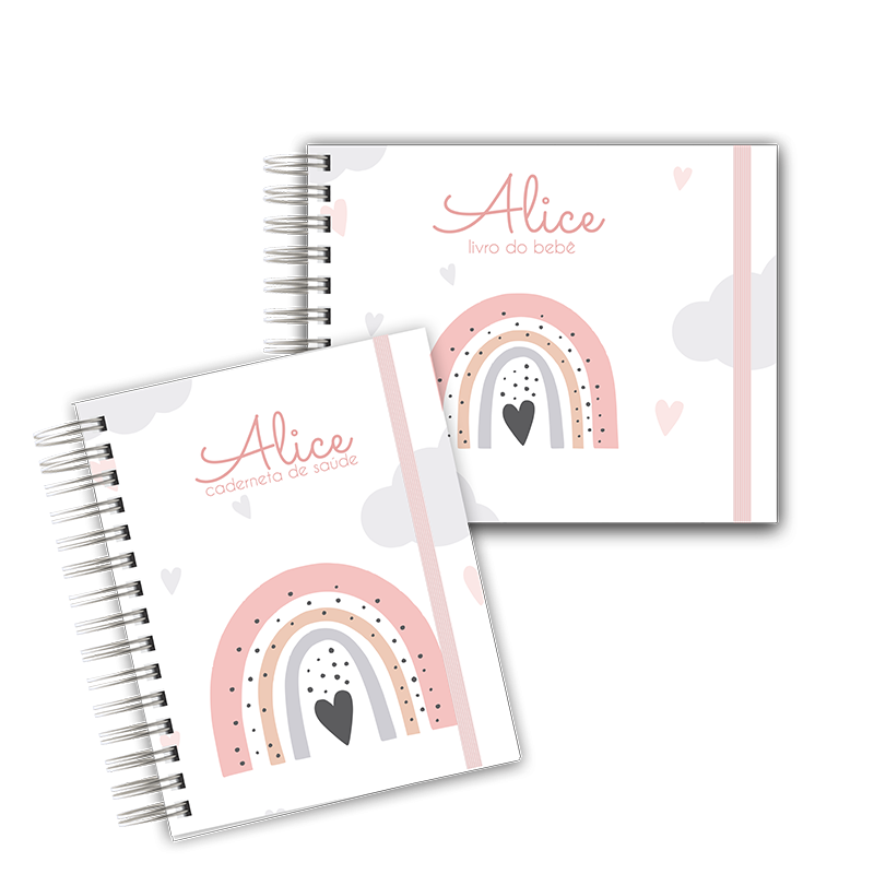 – Capa dura, tamanho 15,5×21,5cm com fechamento em elástico (em cor que combine com o tema) com acrílico e encadernação com wire-o branco.