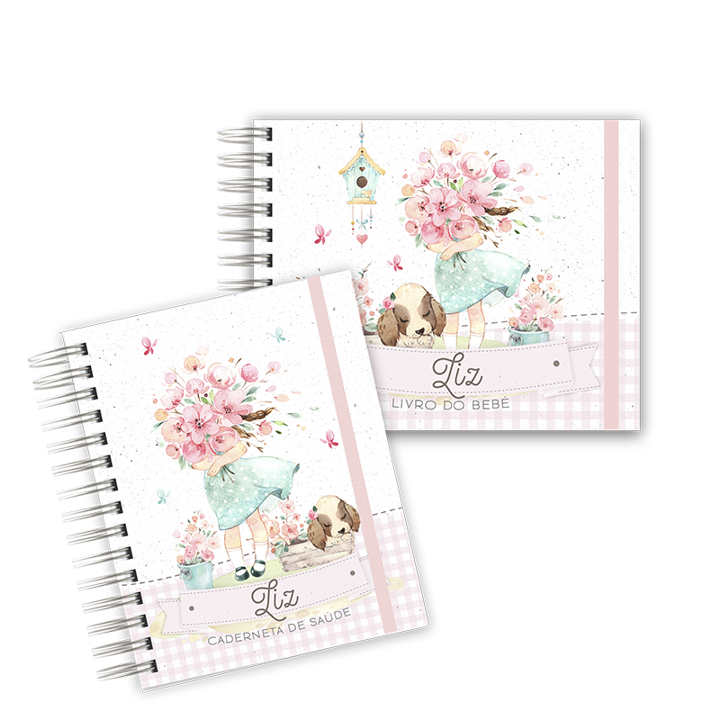 – Capa dura, tamanho 15,5×21,5cm com fechamento em elástico (em cor que combine com o tema) com acrílico e encadernação com wire-o branco.