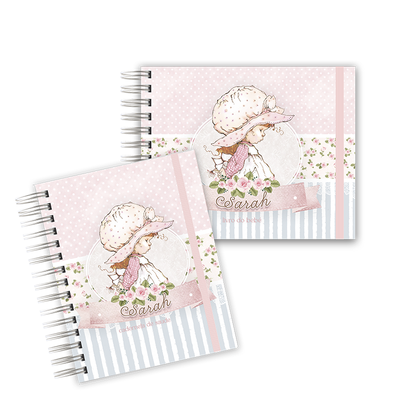 – Capa dura, tamanho 15,5×21,5cm com fechamento em elástico (em cor que combine com o tema) com acrílico e encadernação com wire-o branco.